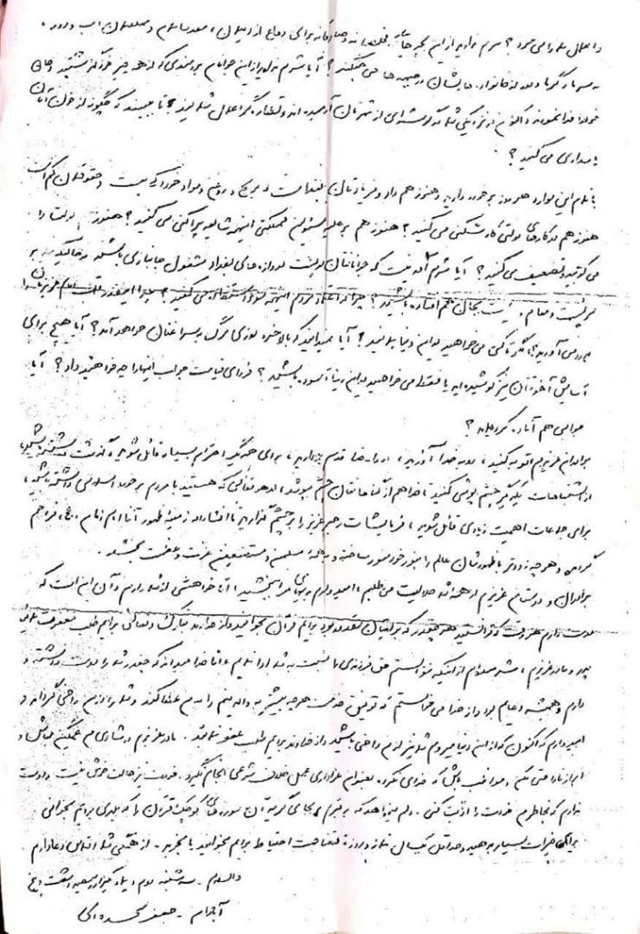 پدر و مادر عزیزم ، شرمنده ام از اینکه نتوانستم حق فرزندی را نسبت بشما ادا نمایم، اما خدا میداند که چقدر شما را دوست داشته و دارم وهمیشه دعایم بود و از خدا می خواستم که توفیق خدمت هرچه بیشتر به والدینم را به من عطا کند وشما را از من راضی گرداند و امیدوارم که اکنون که از این دنیا می روم شما نیز از من راضی باشید واز خداوند برایم طلب عفو نمائید . مادر عزیزم در شادی من غمگین مباش و ابراز ناراحتی مکن و مواظب باش که خدای نکرده بعنوان عزاداری عمل خلاف شرعی انجام نگیرد، خودت نیز حالت خوب نیست ، دلم میخواهد بجای گریه آن سوره های کوچک قرآن را که بلدی برایم بخوانی …..از همگی شما التماس دعا دارم.